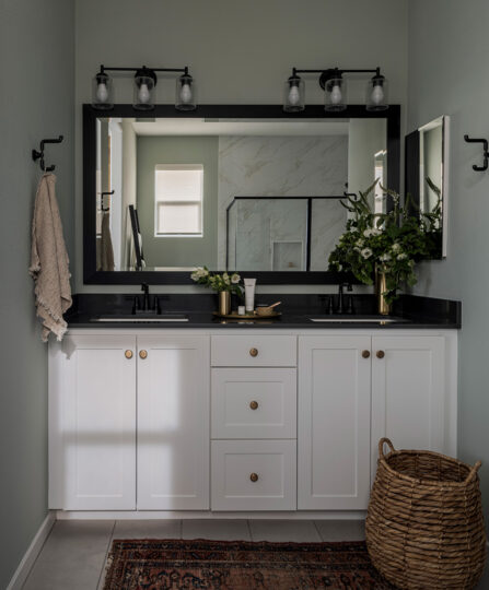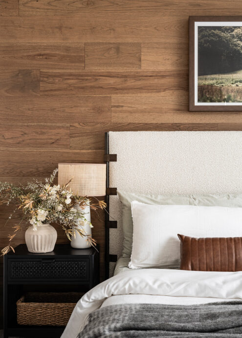 Embrace the comfort of tradition with the elegance of today through the Transitional Farmhouse collection. Evocative of a spring countryside, this fresh take on classic farmhouse styling combines casual linens and woven textures with velvety walnut flooring and deep greens. Pops of black and industrial lighting add graphic punch to a rustic backdrop—arriving at a woodland-inspired interior that’s functional yet chic.